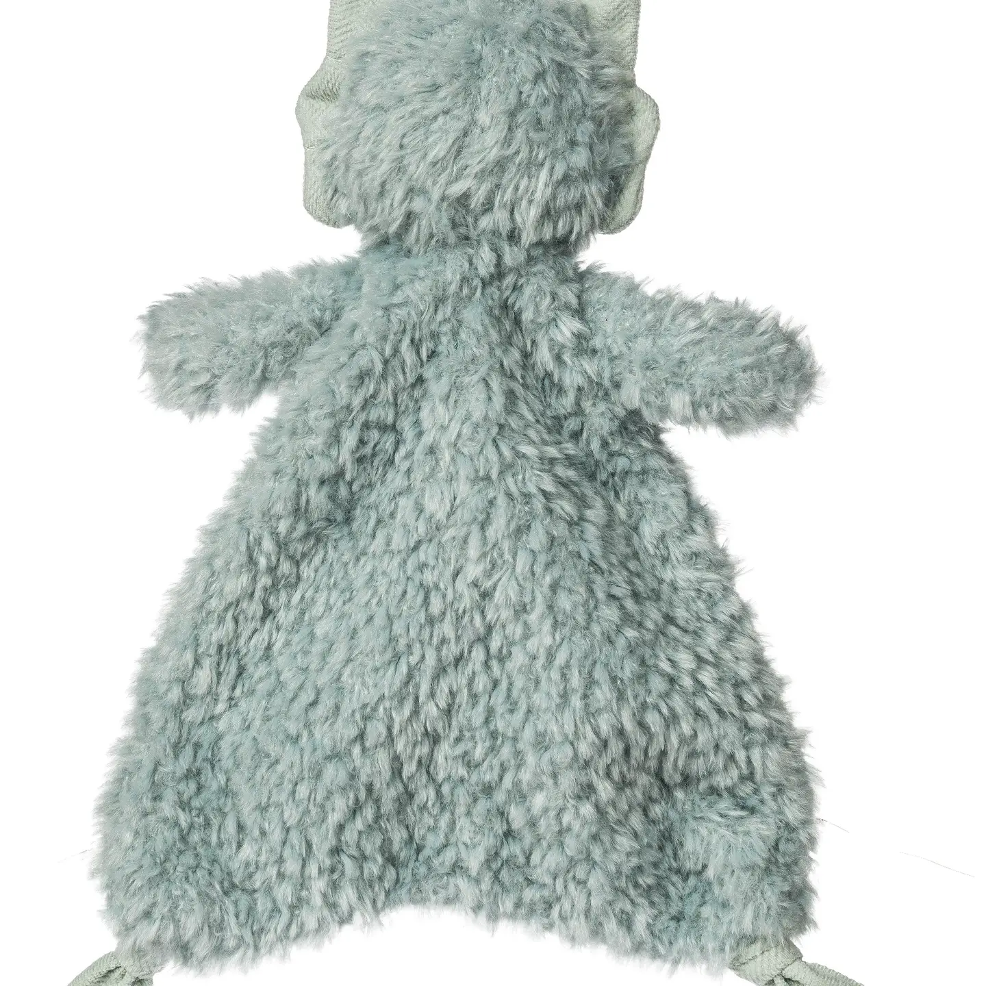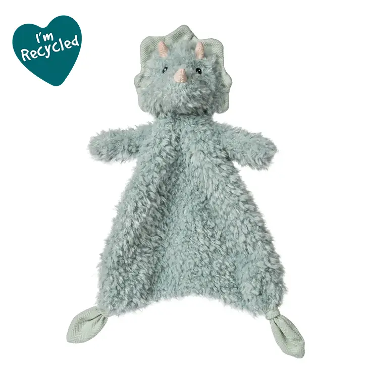 SOFT TOY LOVEY: Dinosaur is a comforting cuddle toy with an under-stuffed body in textured blue fabric with knotted corners at the feet; lovey has a soft sculpted face with embroidered eyes