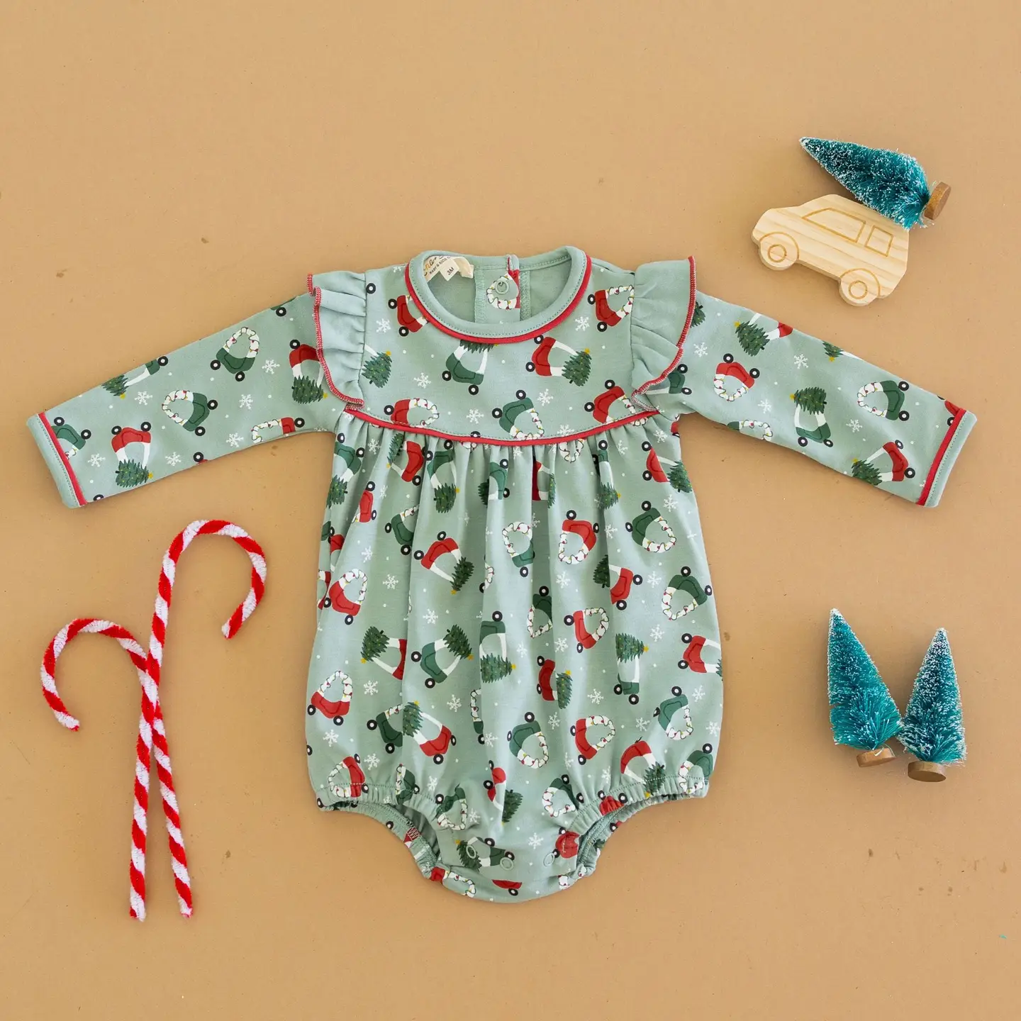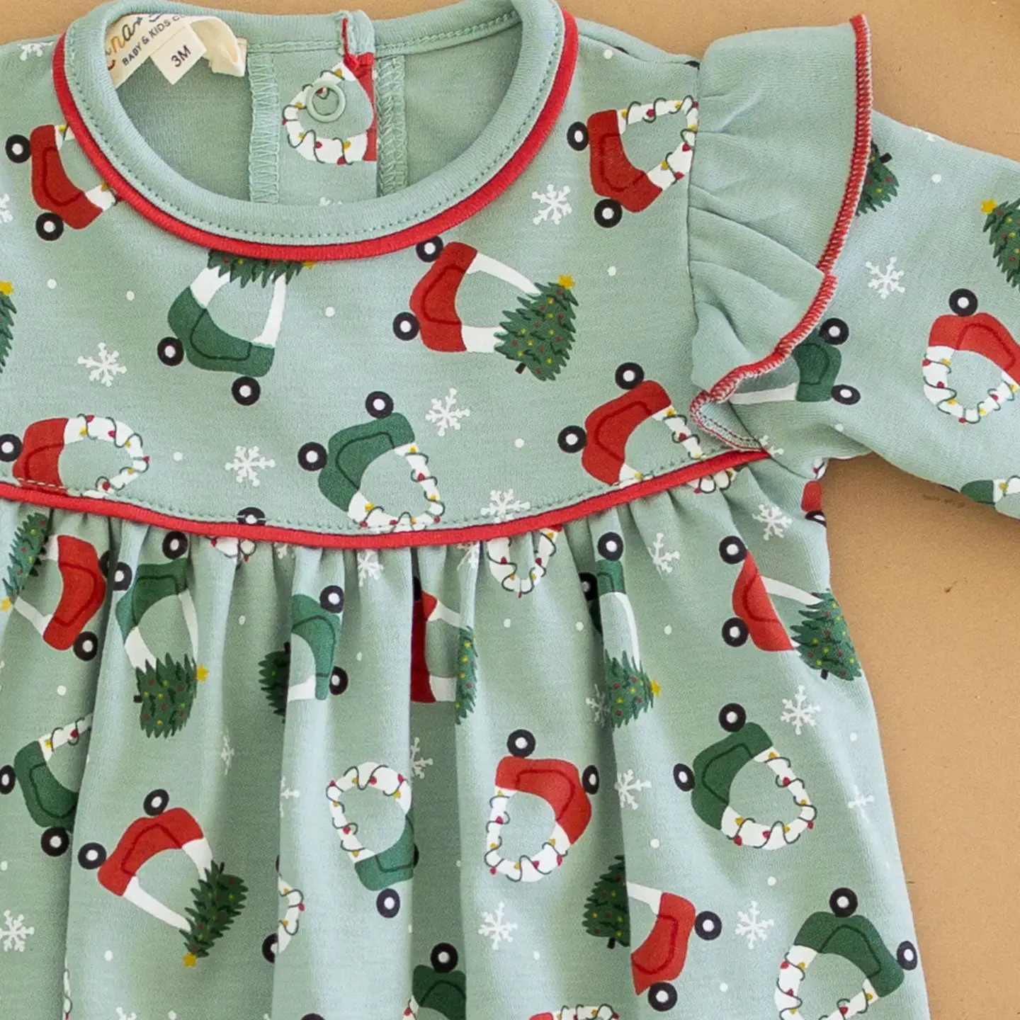 Dress your little girl in classic holiday style with our Deck the Wheels Girl Bubble. This charming one-piece is made from our signature Pima Cotton and features a festive Christmas Truck pattern on the top and a sweet ribbon detail at the neck. It's a perfect choice for holiday parties or photos.
