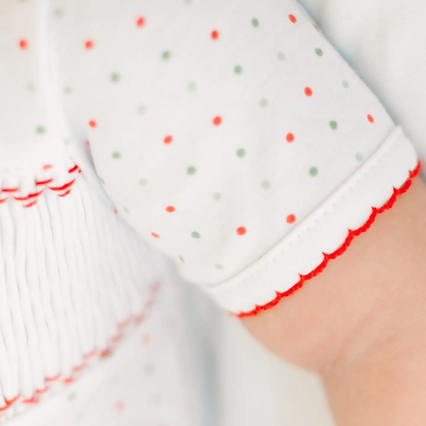 Wrap your little one in our adorable Christmas Joy Classics Smocked Short Sleeve Bubble - Red. Inspired by a traditional Christmas, this luxurious Pima Cotton one-piece combines classic style with a comfortable fit, featuring a charming hand-embroidered smocked pattern, festive red picot trim, and convenient snap closures.