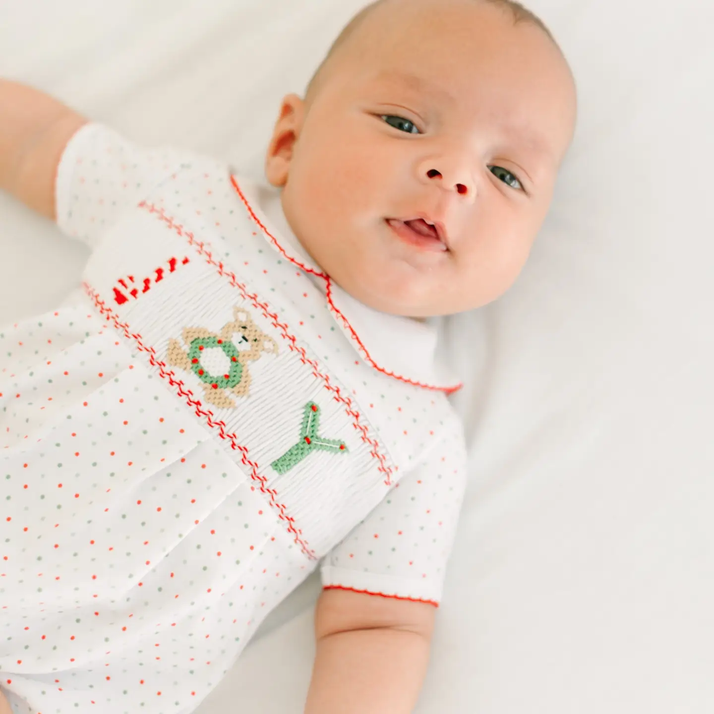 - Hand-Embroidered Smocked Pattern: Features a beautiful smocked design with a candy cane, a teddy bear, and a Christmas tree with the word "joy."