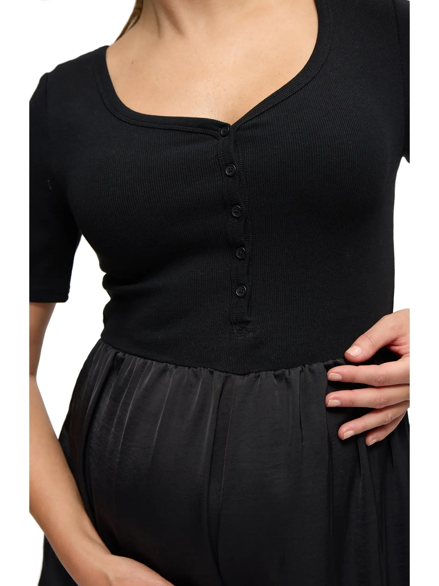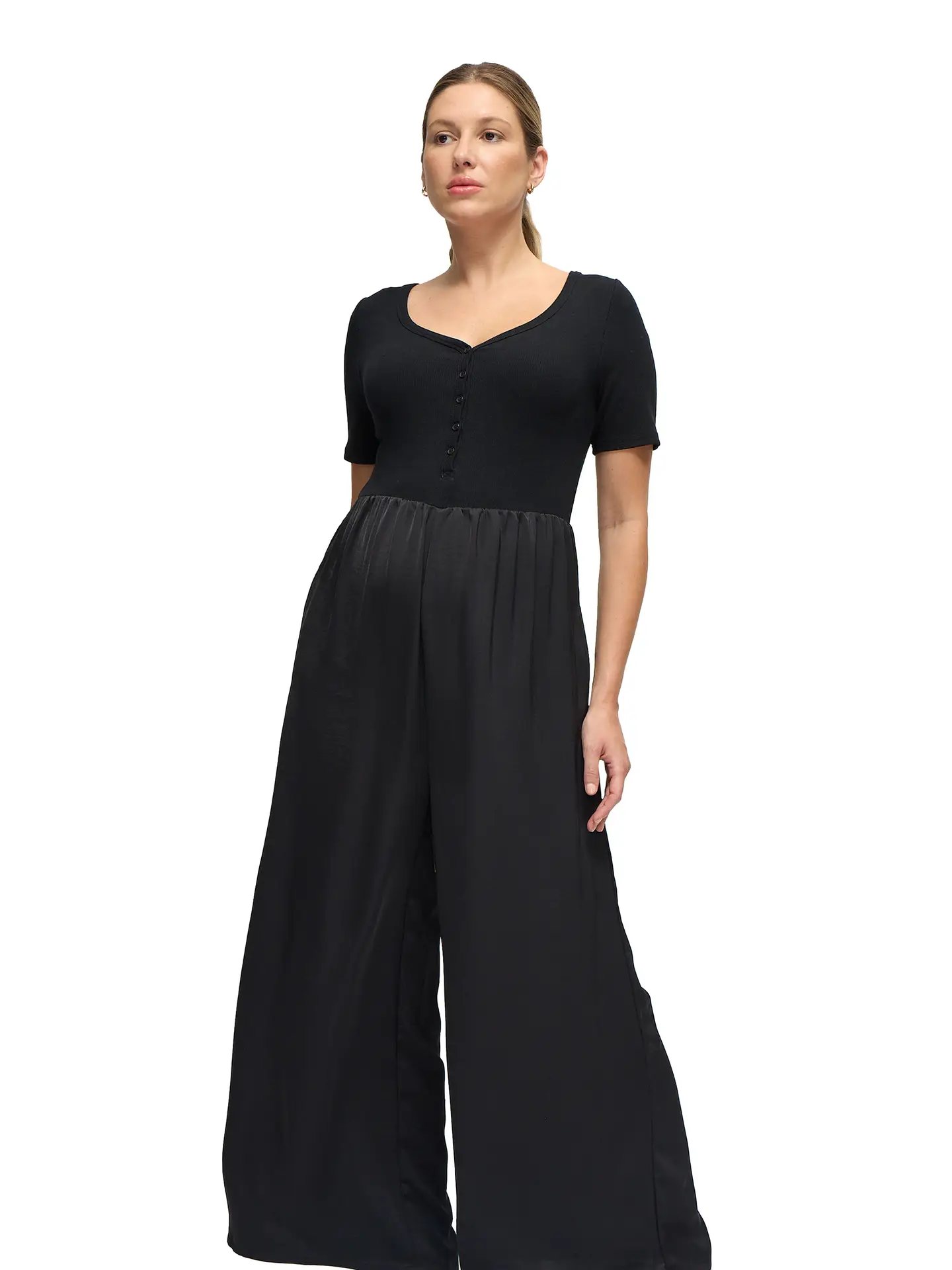 Our Mixed Media Jumpsuit from Ingrid + Isabel is a versatile wardrobe solution designed to keep you stylish and comfortable during your maternity journey. This jumpsuit is a testament to our commitment to creating lasting, hardworking pieces.