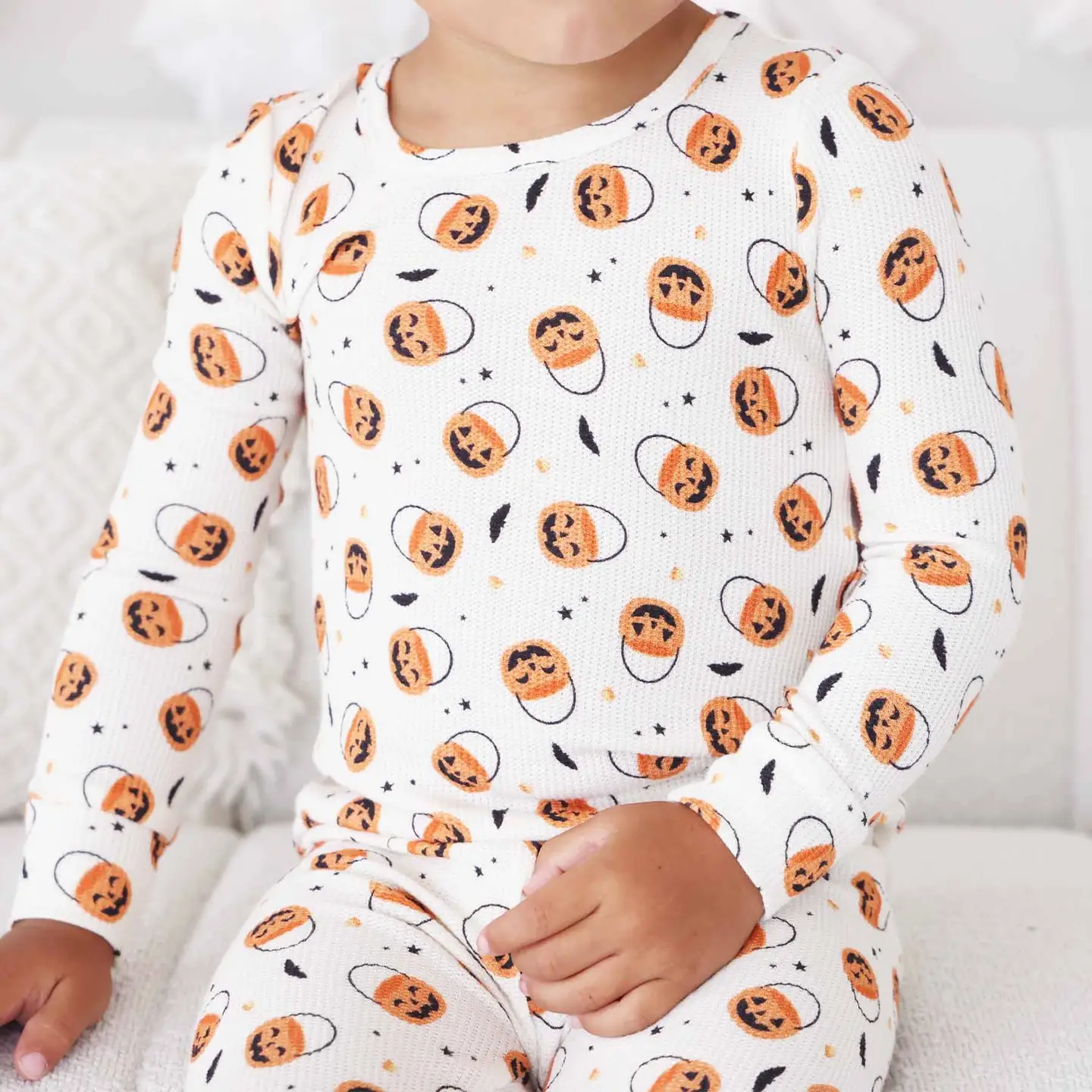 Get your little one ready for a night of spooky fun and cozy cuddles! This kids two-piece pajama set features our adorable trick-or-treat pumpkin bag print on ultra-soft, stretchy bamboo waffle fabric that’s perfect for bedtime, movie nights, and all things Halloween.